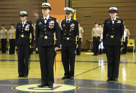 Led by platoon leaders Ensign Brian Weinhart, Ensign Darien Riley and Ensign Amanda Gallo, the cadets — after the playing the national anthem — passed in review before Superintendent of Schools Nancy Carney and other district officials as well as two science instructors and the visiting Commander John Skarin of the New York Navy district recruiting office in East Meadow, who conducted the inspections of each cadets stance, uniform and presentation.