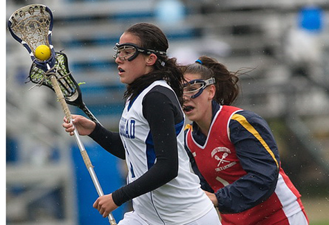 The game marked the conclusion of Riverhead’s inaugural varsity season and served as a farewell for the team’s senior class of three players: attackman Danielle McCabe, defenseman Sara Britt and Griffing. Prior to the opening draw, Riverhead Coach Rich D’Alsace presented flowers to the three of them.