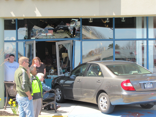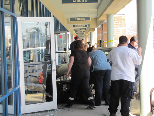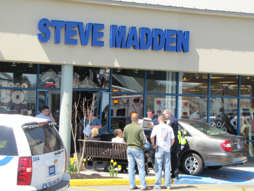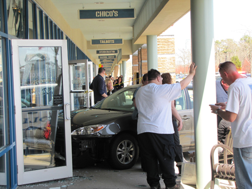 The accident occurred at about 11:30 a.m. when a tan SUV heading north in the road inside Tanger II in Riverhead collided with a Toyota Camry that was heading west. The Camry then veered off and crashed into the front door of the store, according to Sgt. Tim Palmer of the Riverhead Police Department.