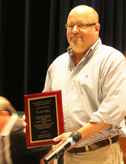 The Riverhead school board took a moment during its final meeting of the 2011-12 school year to honor longtime board member Timothy Griffing’s final night on the board.
