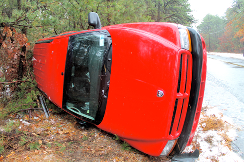 Icy roads from Wednesday night’s nor’easter caused a rollover crash in Calverton Thursday morning, Riverhead police said.