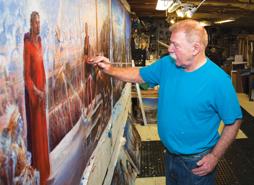 Greenport’s mural man, Terrence Joyce, likes to listen to Indian music in his home studio and use dance-like movements to achieve broad paint strokes.