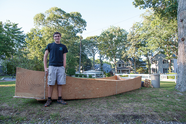 Photo Caption: Christian Shackel of Aquebogue has spent the past few weeks constructing an 18-foot wooden boat he plans to use for clamming. (Credit: Chris Lisinski)