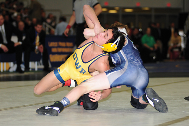 Photo Caption: Shoreham-Wading River senior Kevin Meloni wrestles Adam Busiello in the 106-pound county finals Sunday at Hofstra University (Credit: Bill Landon).