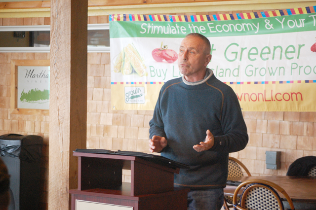 Photo Caption: Carl Novak from Half Hollow Nursery speaks at the meeting Monday. (Credit: Nicole Smith)