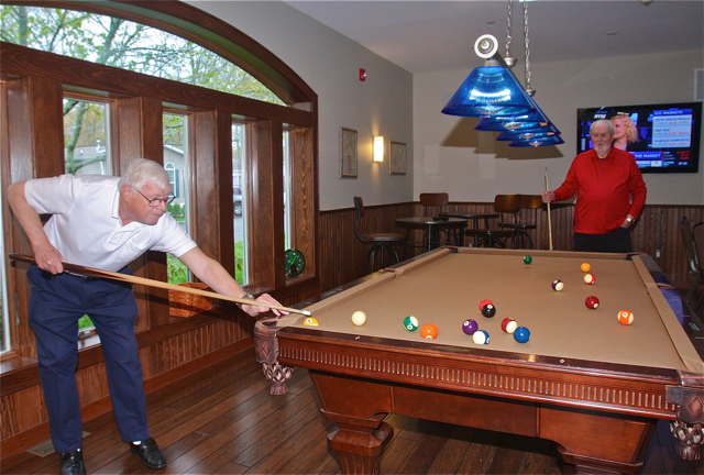 Photo Caption: Scotty Robertson (left) and John Machalski shoot a round of pool in the new “Map Room” at Glenwood Village. (Credit: Barbaraellen Koch)