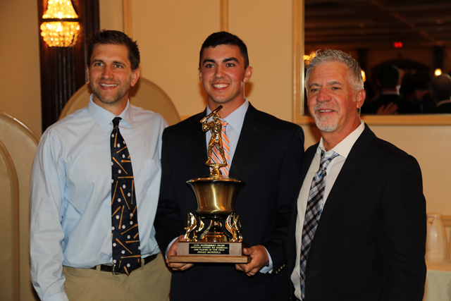 Top Photo Caption: Brian Morrell pictured with varsity coach Kevin Willi (left) and former Shoreham-Wading River coach Sal Mignano. (Credit: Joe Werkmeister)