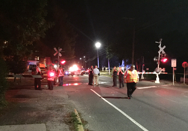 Photo Caption: Police on scene investigating the train incident near East Main Street and Riverside Drive Tuesday night. (Credit: Paul Squire)