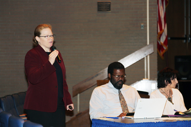 Photo Caption: Elizabeth Scaduto, Director of ENL, giving a presentation during Tuesday night’s school board meeting. (Credit: Nicole Smith)