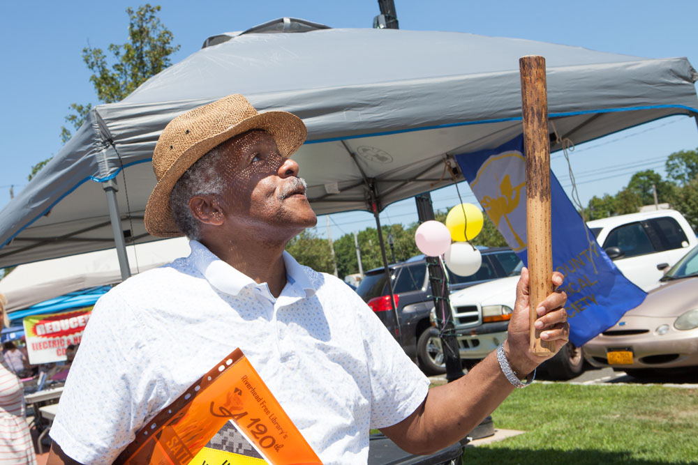 “Harry of Riverhead” tries out a rain stick from a display provided by the Southold Indian Museum. (Credit: Katharine Schroeder)Ody Gochez, 8, and sister Rosie, 3, enjoy watermelon. (Credit: Katharine Schroeder)Peyton LaCombe, 9, of Riverhead accepts a slice of watermelon from Riverhead firefighter Joe Berezny. (Credit: Katharine Schroeder)A table set up to send best wishes to the library. (Credit: Katharine Schroeder)One of the many greetings. (Credit: Katharine Schroeder)Booths lined Osbourne Avenue. (Credit: Katharine Schroeder)Puppet show. (Credit: Katharine Schroeder)A collection area set up for time capsule contents. (Credit: Katharine Schroeder)Jonathan Gochez, 10, of Riverhead writes a secret message to be placed in the time capsule. (Credit: Katharine Schroeder)