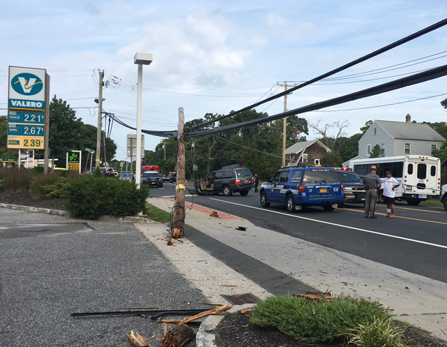 Photo caption: The downed pole on Flanders Road Monday morning. (Credit: Jen Nuzzo)