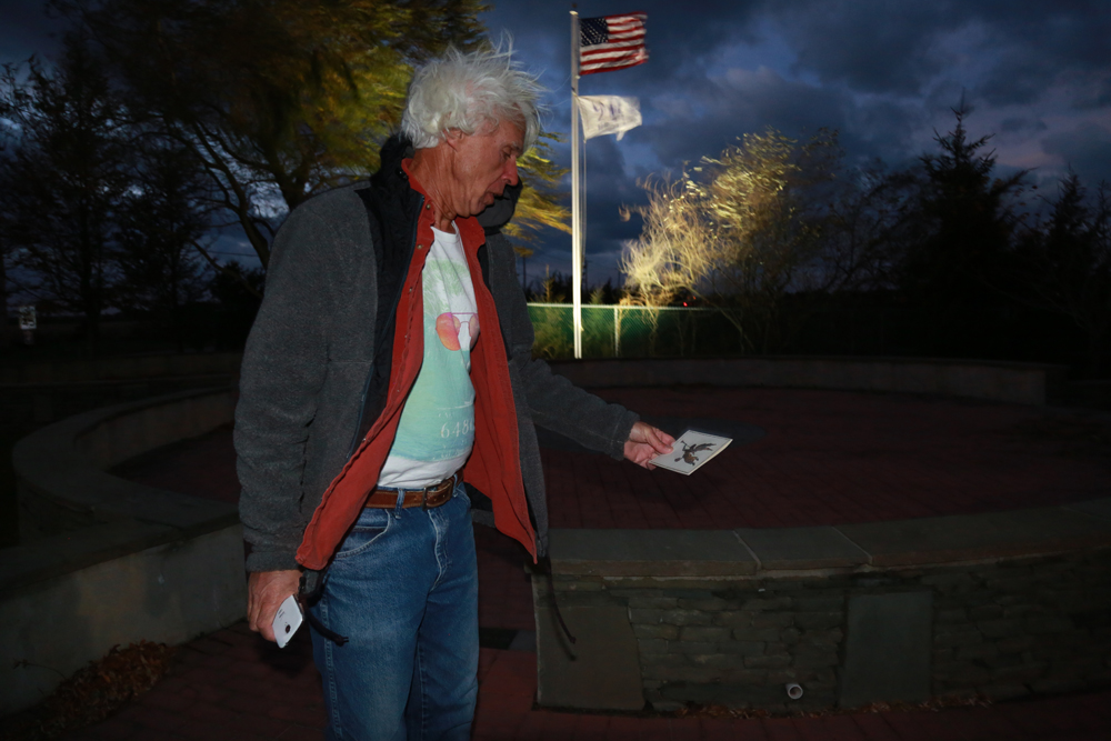 Photo caption: Calverton resident Hal Lindstrom stands at the World Trade Center memorial in Calverton and holds a photo of the missing statue. Mr. Lindstrom said he was convinced the statue had been stolen.