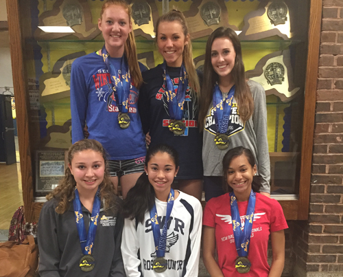 Photo caption: Clockwise, starting from top left: Shoreham-Wading River’s Alexandra Hays, Maria Smith, Payton Davis, Katherine Lee, Francesca Lily and Alexandra Smith showing of their newly won hardware. (Credit: Bob Liepa)