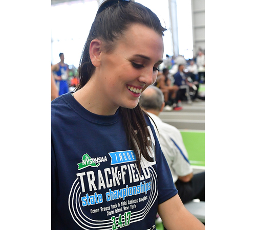 Photo caption: Shoreham-Wading River senior Payton Capes-Davis had a lot to smile about after earning a winner’s medal as a member of Section XI’s triumphant distance-medley relay team. (Credit: Robert O’Rourk)