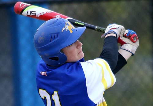 Photo caption: Sam Dickerson went 4-for-4, driving in three Mattituck runs in an 11-3 defeat of Bishop McGann-Mercy. (Credit: Garret Meade)