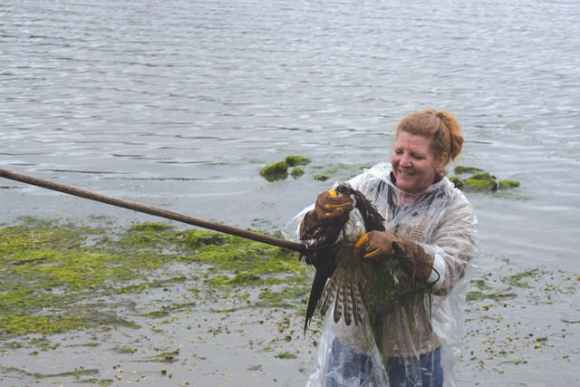 Ms. Wood Pultz said nearby resident Tom Wacker came to help, bringing out a long crab net that they used to catch the bird. Once she restrained the osprey by grabbing hold of its beak and feet, Mr. Wacker used scissors to release the clam.