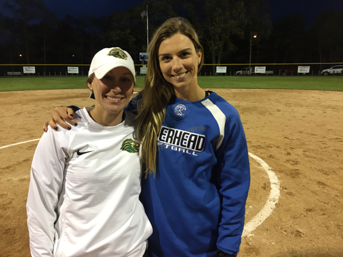 When Riverhead’s two high school softball teams faced each other Saturday night, not only was it a double senior night, but it was also an intriguing matchup of opposing coaches. Bishop McGann-Mercy’s Rose Horton and Riverhead’s Jackie Zilnicki have been friends since they were Little League teammates. Both went on to play for the respective teams they’re currently coaching. Last year Horton was Zilnicki’s assistant coach at Mercy.
