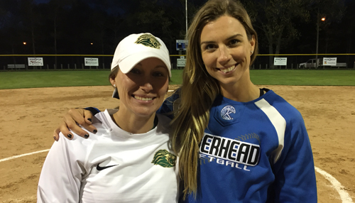 Photo caption: Bishop McGann-Mercy coach Rose Horton, left, and Riverhead coach Jackie Zilnicki following Saturday night’s game at Stotzky Park. (Credit: Bob Liepa)