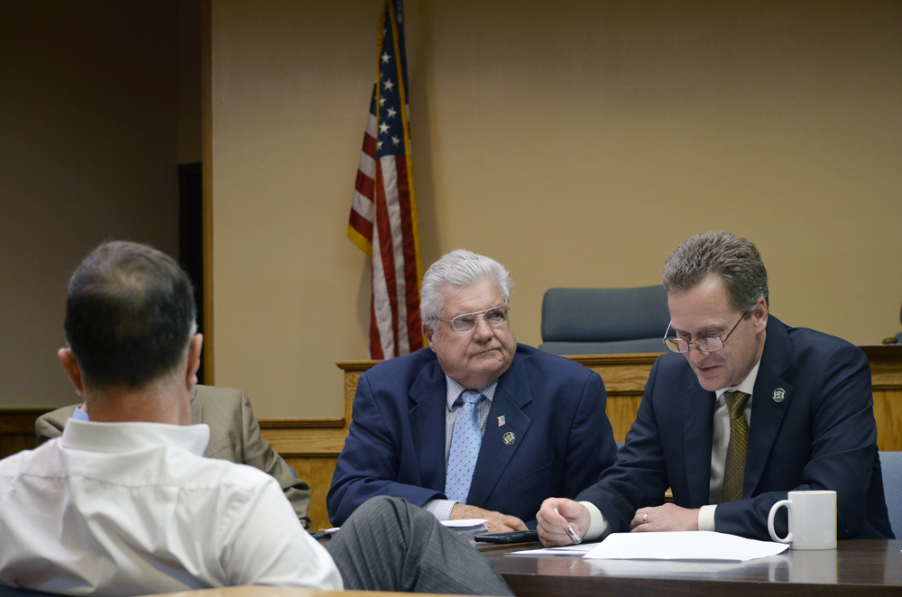 Photo caption: John Dunleavy, center, seated next to Supervisor Sean Walter earlier this year. (Credit: file photo)