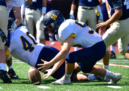 Photo caption: Shoreham-Wading River’s Jake Meeker collects a loose ball off the opening kickoff for the first of his three fumble recoveries. (Credit: Robert O’Rourk)