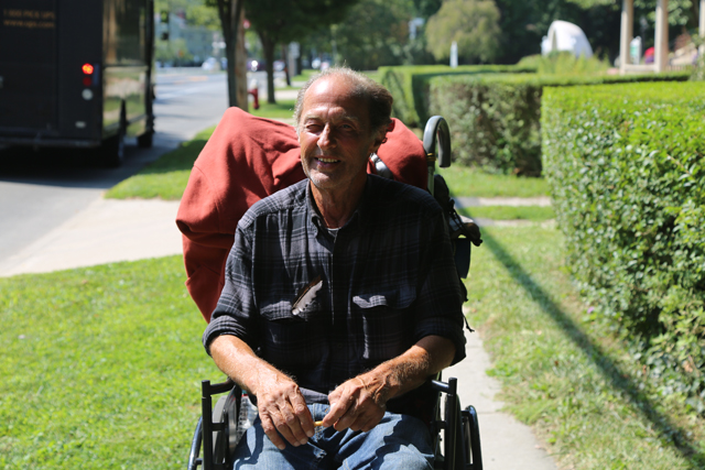 Photo caption: Richard Harrell in his wheelchair along Main Road in Southold. (Credit: Rachel Siford)