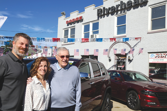 Photo: TJ Strollo (from left), Jane Millman and Tony Strollo in front of the Dodge dealership they have owned for 41 years. The family plans to expand and move to Route 58. (Credit: Rachel Siford)