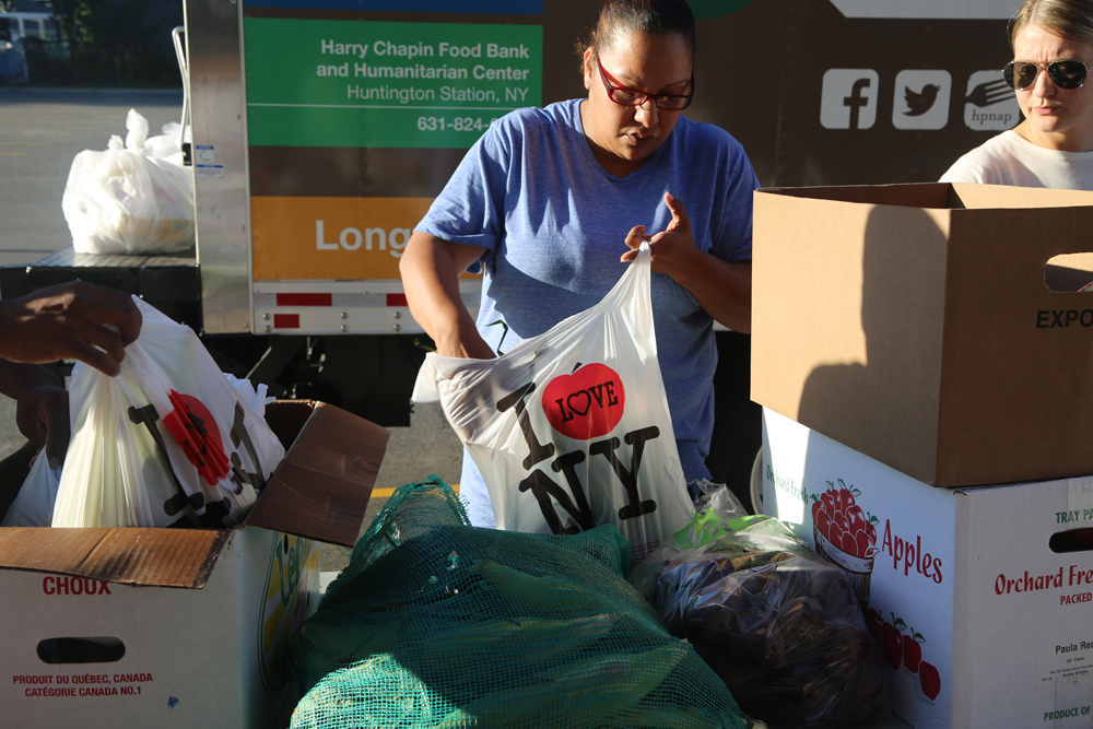 Parked outside Roanoke Avenue Elementary School last Thursday afternoon, volunteers from Long Island Cares filled bags with corn, apples, ground turkey and more for community members in need.