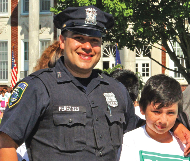 Riverhead resident Byron Perez dons the navy blue uniform of a Riverhead Town police officer by day. Mr. Perez, who was hired in December 2014, is the department’s first full-time Hispanic officer. Speaking fluent Spanish, he has been working on bridging the gap between local law enforcement and the town’s growing Hispanic population.
