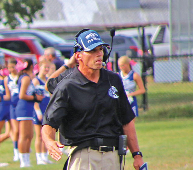 Photo caption: Riverhead assistant coach Bill Hedges on the sideline of a football game this past fall. (Credit: Joe Werkmeister)