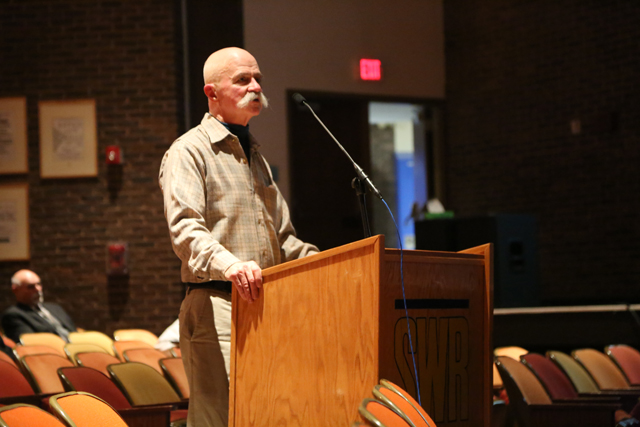 Photo caption: Bob Sweet addresses the Shoreham-Wading River Board of Education Tuesday night, asking them to consider keeping Briarcliff and to explore other options for the property. (Credit: Rachel Siford)