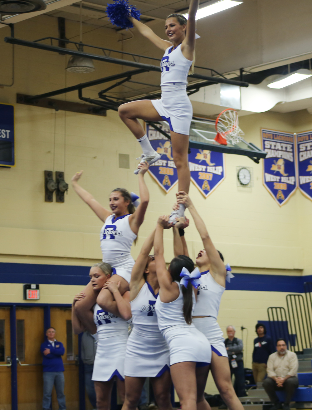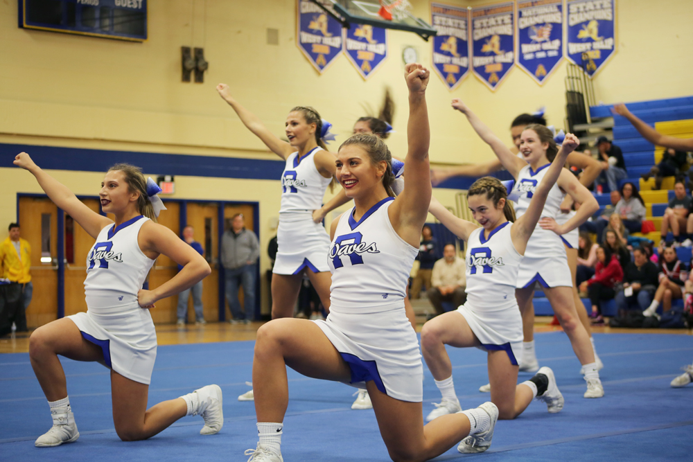 Photo caption: The Riverhead cheerleading team performs Saturday at West Islip High School. (Credit: Joe Werkmeister)