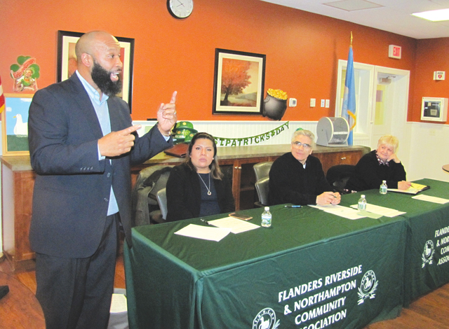 Photo caption: Kyle Braunskill, executive director of the Safe Harbor Mentoring program, speaks Monday before the Flanders, Riverside & Northampton Community Association. (Credit: Tim Gannon)