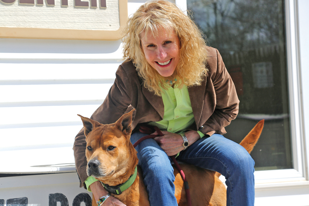 Photo caption: Pamela Green, executive director of Kent Animal Shelter in Calverton, with Andre, a dog currently available for adoption at the no-kill facility. (Credit: Rachel Siford)