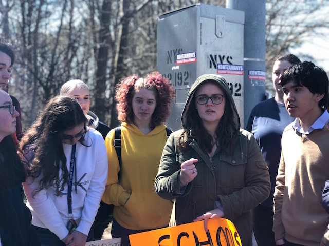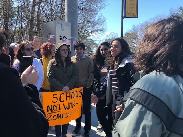 Photo caption: About 20 Shoreham-Wading River High School students joined the national walkout. (Credit: Kelly Zegers)