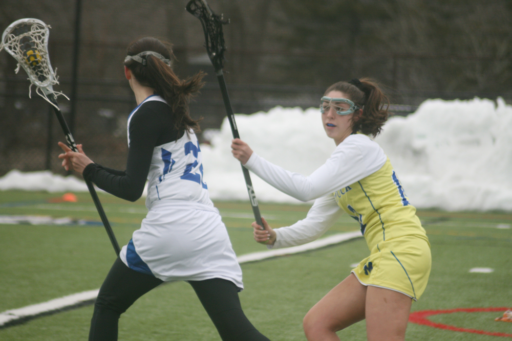 Photo caption: Riverhead’s Lauren Kenny, left, and Mattituck/Southold’s Brianna Fox and their lacrosse teams played each other on March 20, the first day of spring, when piles of snow bordered the field at the Pulaski Sports Complex in Riverhead. (Credit: Bob Liepa)