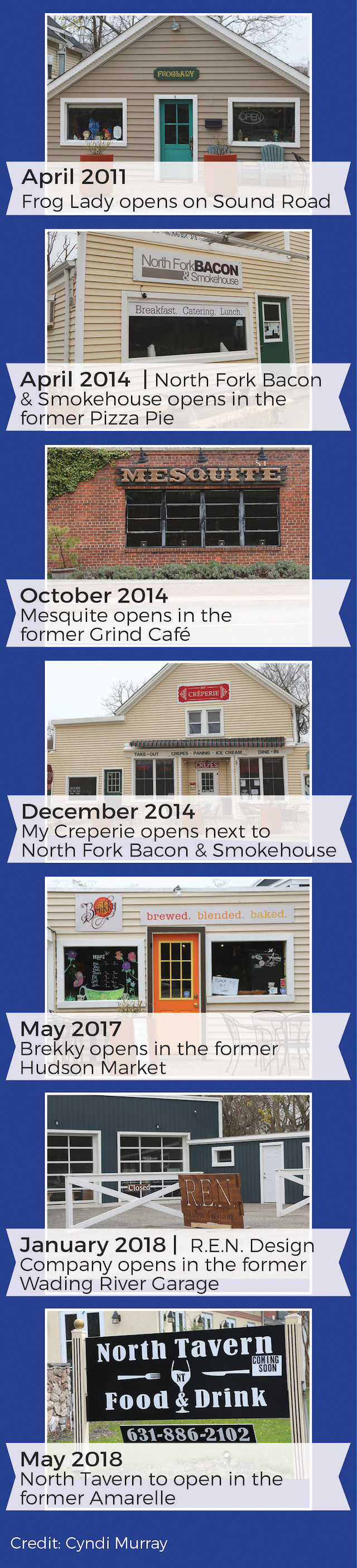 The now fully occupied bank of Sound Road storefronts also includes North Fork Bacon & Smokehouse, My Creperie, retail shop Frog Lady, jewelry store Bellisimo Luxe and a café, Brekky, which opened last year.