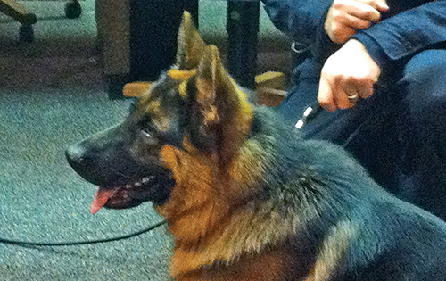 Photo caption: Rocky pictured at a 2011 Town Board meeting when he first joined the department. (Credit: Tim Gannon)