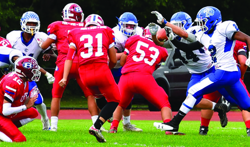 Photo caption: Riverhead’s Liam Egan (second from right) blocking an extra-point attempt by Bellport’s Christian Moreno (31) on Oct. 6. (Credit: Robert O’Rourk file)