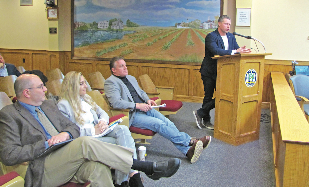 Photo caption: Representatives of Island Exterior Fabricators asked the Riverhead IDA Monday for tax incentives on their proposed expansion. From left: Jeffrey Robinson, Danielle Imbriano and Tim Stevens, with Ed Harms at the microphone. (Tim Gannon photo)