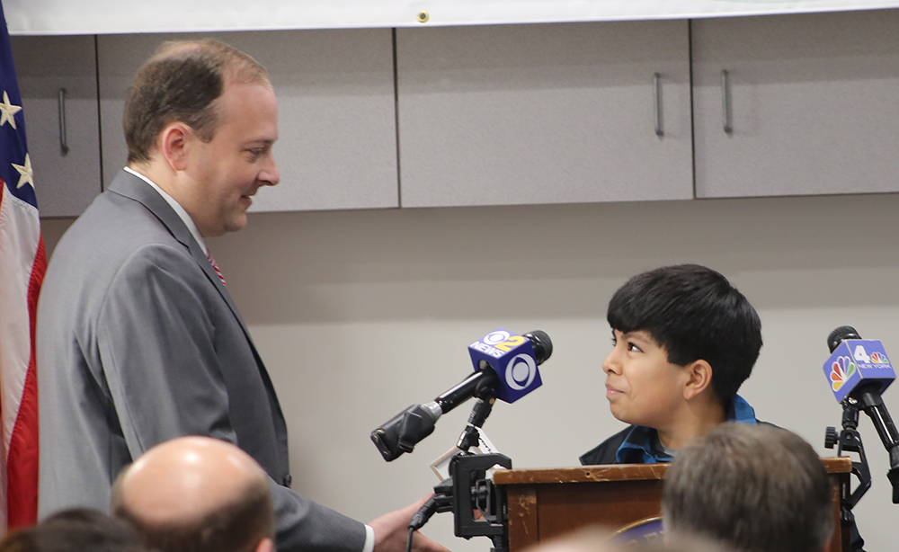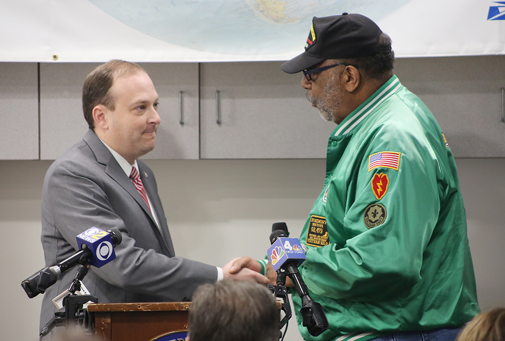 Mr. Zeldin asked Ms. Lewis to join him as he announced the introduction of the Pfc. Garfield M. Langhorn Memorial Semipostal Stamp to Benefit our Veterans Act of 2019.