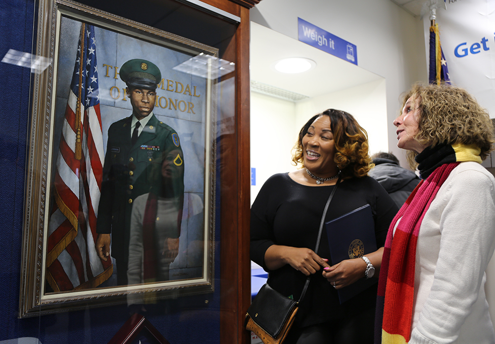Top photo caption: Venetia Lewis, left, and Doris Eve admire the painting of Pfc. Langhorn in the Riverhead Post Office. (Credit: Joe Werkmeister)