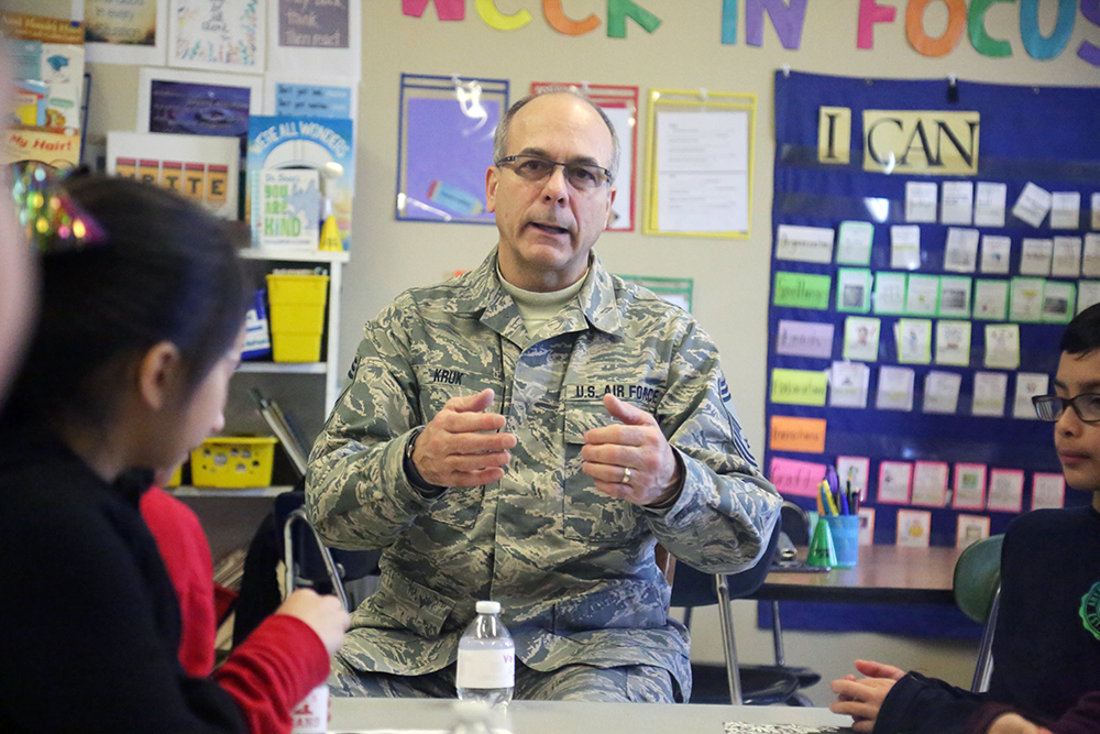 In his role at the 106th, Chief Master Sgt. Kruk said he stays at the base. Active members of the Air Force will move between bases every four years, he said. The students asked questions about his family and career experience.