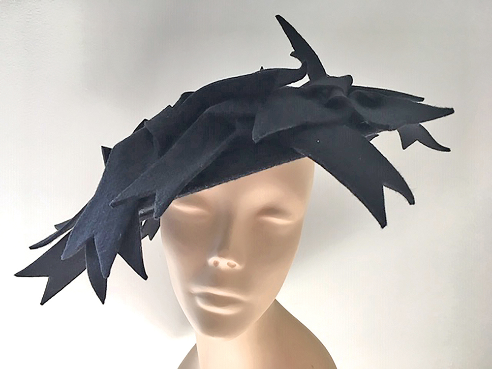 Ms. Gisiger’s design, “Poison,” is a black oversized cocktail beret featuring handmade felt flowers and is inspired by the beautiful but deadly castor bean plant.