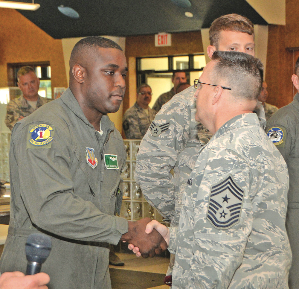 Photo caption: U.S. Chief Master Sgt. Harold L. Hutchison, command chief of the North American Aerospace Defense Command and U.S. Northern Command, coins Airmen at New York Air National Guard’s 106th Rescue Wing, Westhampton Beach, New York on Oct. 3, 2017. Chief Hutchison thanked the members of the 106th for their hard work and dedication to saving lives during the Hurricane Harvey and Hurricane Irma relief efforts. (U.S. Air National Guard photo by Airman 1st Class Daniel H. Farrell)
