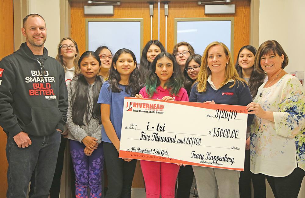 The i-tri program, based in East Hampton, is currently active in 10 schools from Montauk to Mastic. Third-generation Riverhead Building Supply owners Tracy Kappenberg and Kevin Goodale visited the school last week to meet some of the girls and present them with the check.