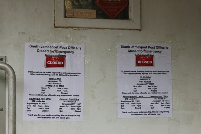 In the meantime, post office employees’ and customers’ mail have been rerouted to the Jamesport Post Office on Route 25.