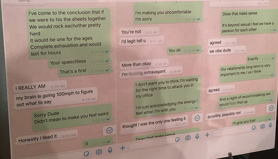 One printout of text messages the attorney displayed includes an exchange that began at 4:48 a.m. April 29, in which Mr. Regan encourages her to go to his office that day and describes details of what he wanted to do with her sexually.