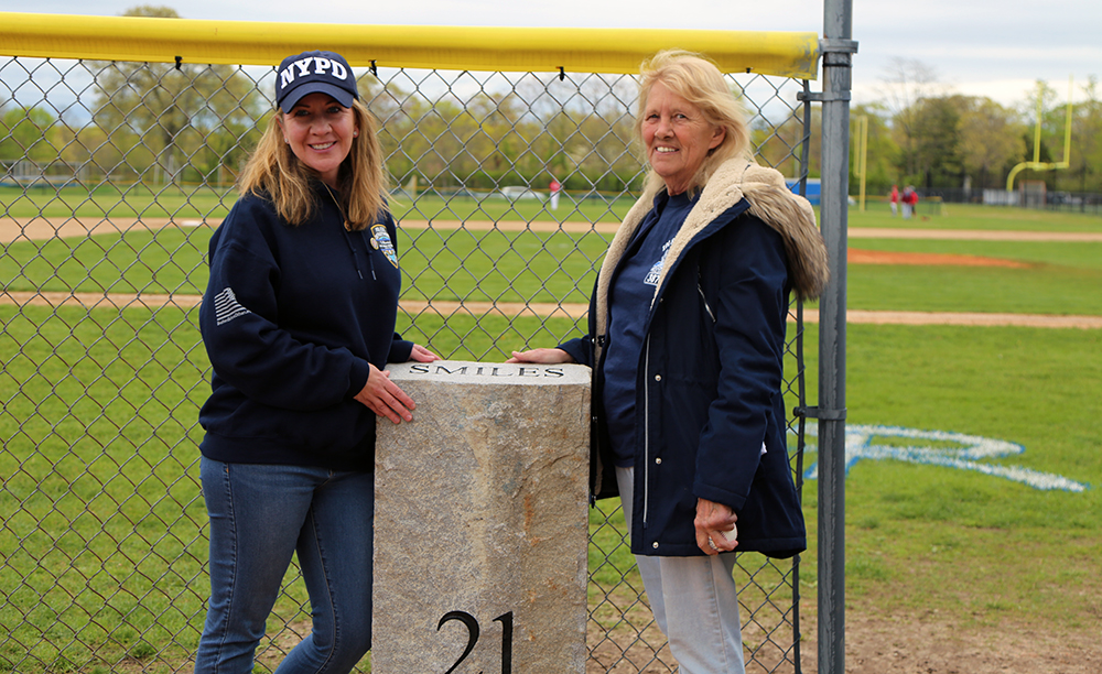 Photo caption: Leanne, left, and Linda Simonsen pose next to the monument unveiled at the Riverhead baseball field. (Credit: Joe Werkmeister)