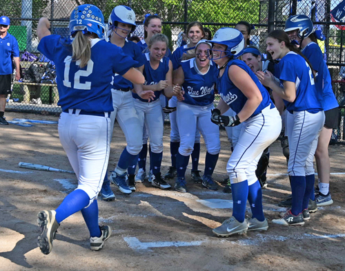 Photo caption: Riverhead senior Brooke McKay met a happy welcoming committee at home plate after hitting the first of her two home runs. She finished with seven RBIs on Senior Day. (Credit: Robert O’Rourk)