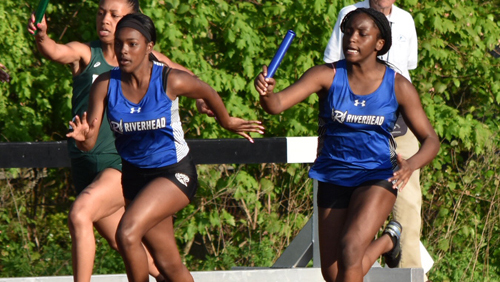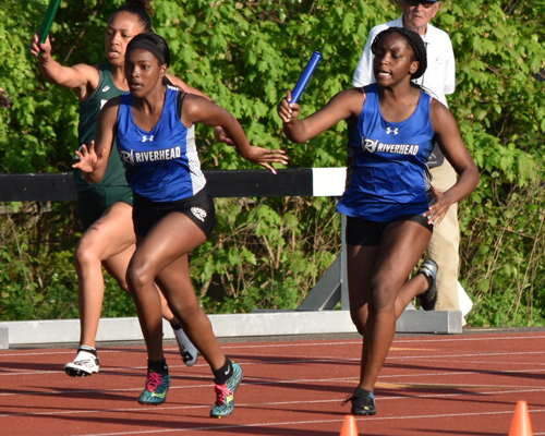 Riverhead’s 4×100-meter relay team took first place in the Section XI girls track and field division championships at Ward Melville High School Wednesday. Juniors Ashli Bell and Miasha Pittman joined with freshmen Enaria Suazo and Emani Womack for a winning Division I time of 49.79 seconds.